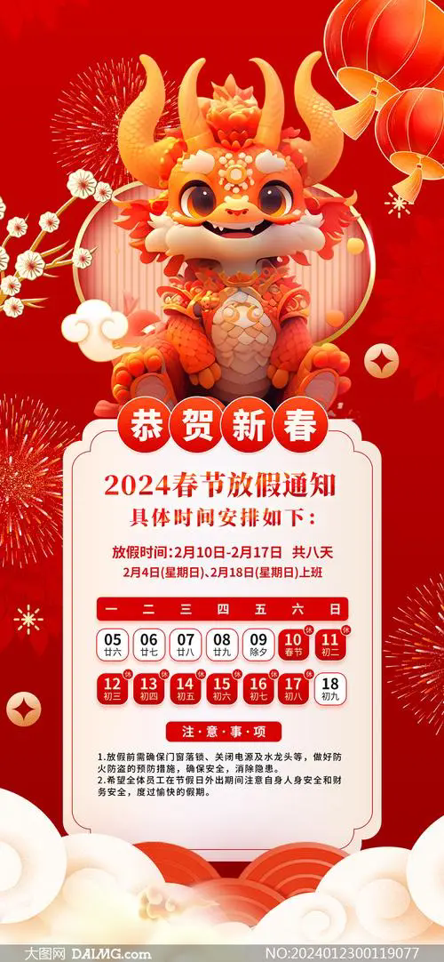 根據(jù)《國務(wù)院辦公廳關(guān)于2024年部分節(jié)假日安排的通知》,2月10日至17日放假調(diào)休,共8天。2月4日(星期日)、2月18日(星期日)上班。鼓勵(lì)各單位結(jié)合帶薪年休假等制度落實(shí),安排除夕正式放假(2月9日)休息。停止發(fā)貨時(shí)間為2月3號(hào)。請(qǐng)各部門做好安全檢查,相關(guān)工作安排和處理。